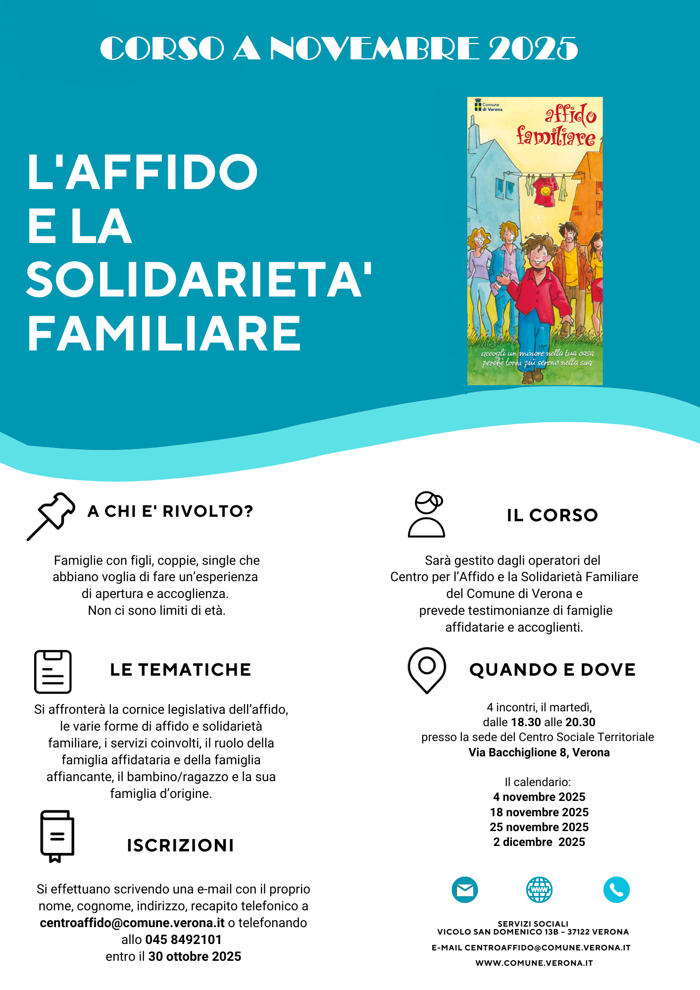 Il Centro per l’Affido e la Solidarietà Familiare del Comune di Verona propone dal 4 novembre al 2 dicembre quattro incontri per approfondire il tema dell'affido e diverse tematiche correlate: