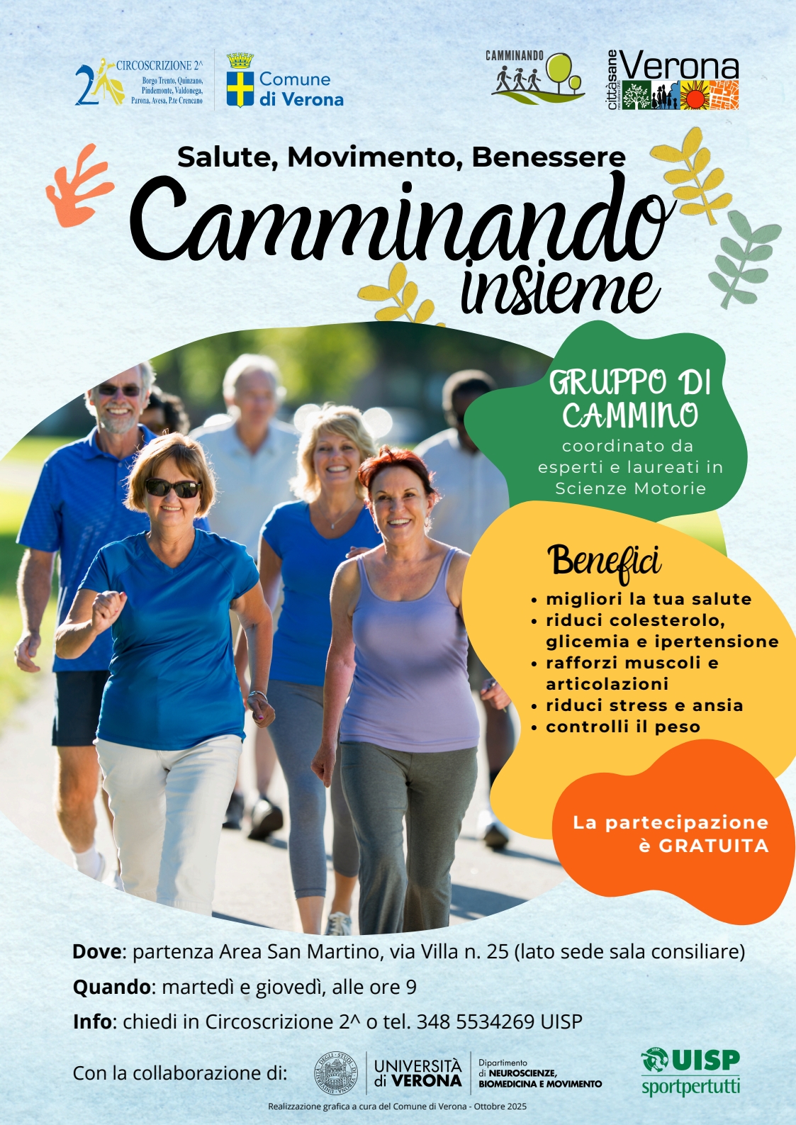 Nell'ambito della "Rete Città Sane Italiane", la Circoscrizione 2ª in collaborazione con l'Associazione "Camminando", l'Università degli Studi di Verona - Dipartimento di Neuroscienze, Biomedicina e Movimento, UISP Comitato Territoriale Verona APS ha organizzato il gruppo di cammino