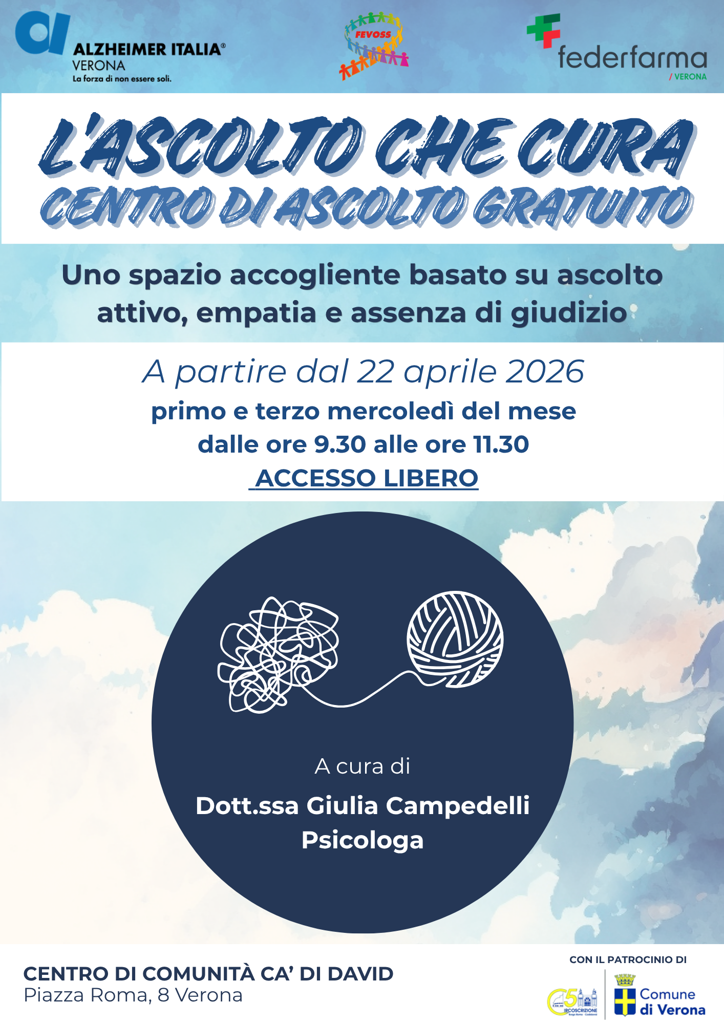 è attivo il Centro di ascolto gratuito, uno spazio accogliente basato su ascolto attivo, empatia e assenza di giudizio, a cura della Dott.ssa Giulia Campedelli psicologa