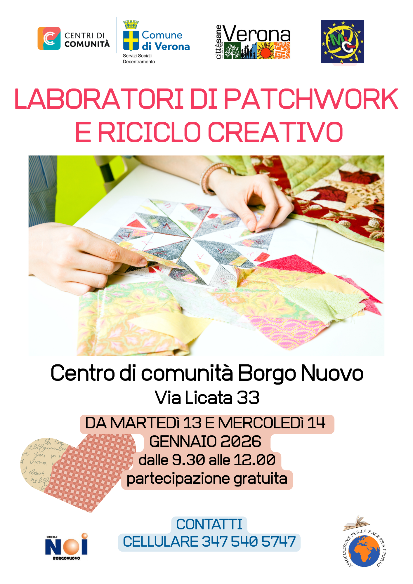 Il Centro di Comunità Borgo Nuovo in via Licata n°33 (Verona), organizza LABORATORI DI PATCHWORK E RICICLO CREATIVO a partire da martedì 13 e mercoledì 14 gennaio 2026 dalle ore 9:30 alle 12:00.