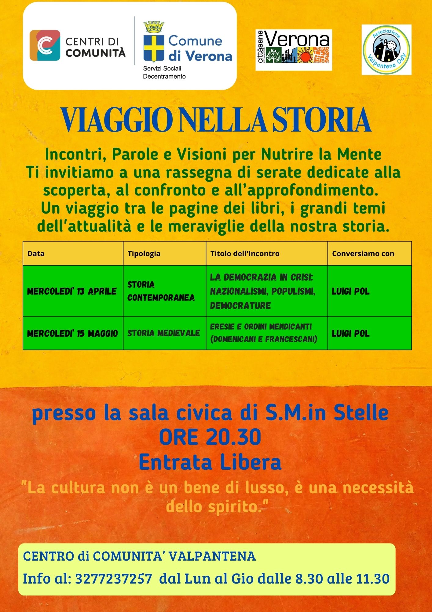 Il Centro di Comunità Valpantena organizza due incontri presso la sala Civica di S.M. Stelle dal titolo "Viaggio nella storia"condotti da Luigi Pol.