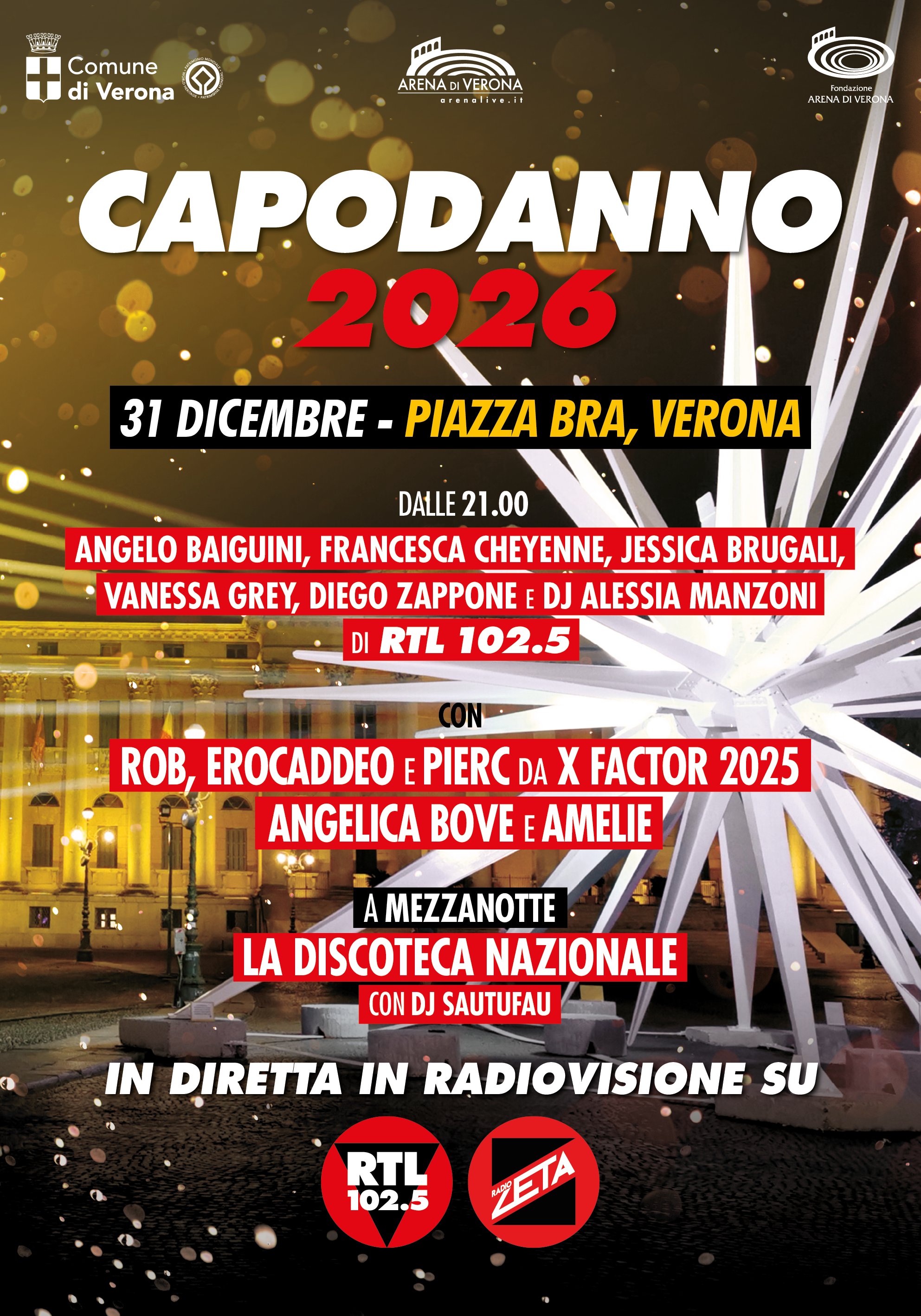 RTL 102.5 e Radio Zeta sono pronte a festeggiare il Capodanno con "Big & Bang", il concerto in programma il 31 dicembre promosso dal Comune in collaborazione con Fondazione Arena di Verona e Arena di Verona Srl.