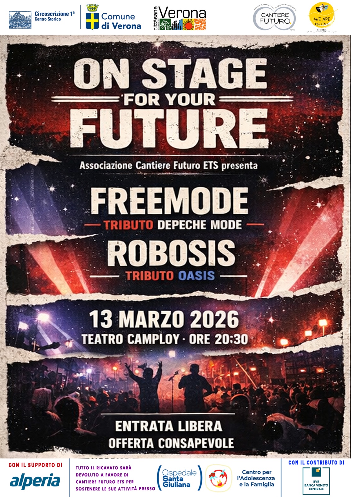 Venerdì 13 marzo al Teatro Camploy, a partire dalle ore 20.30, Cantiere Futuro ETS e Circoscrizione 1^ vi aspettano per un imperdibile concerto benefico "On stage for your future".