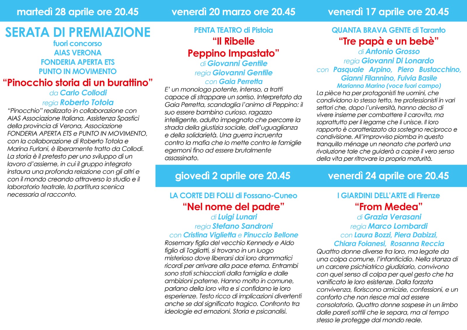 Cinque gli spettacoli ammessi alla Rassegna che rappresentano Autori italiani contemporanei.