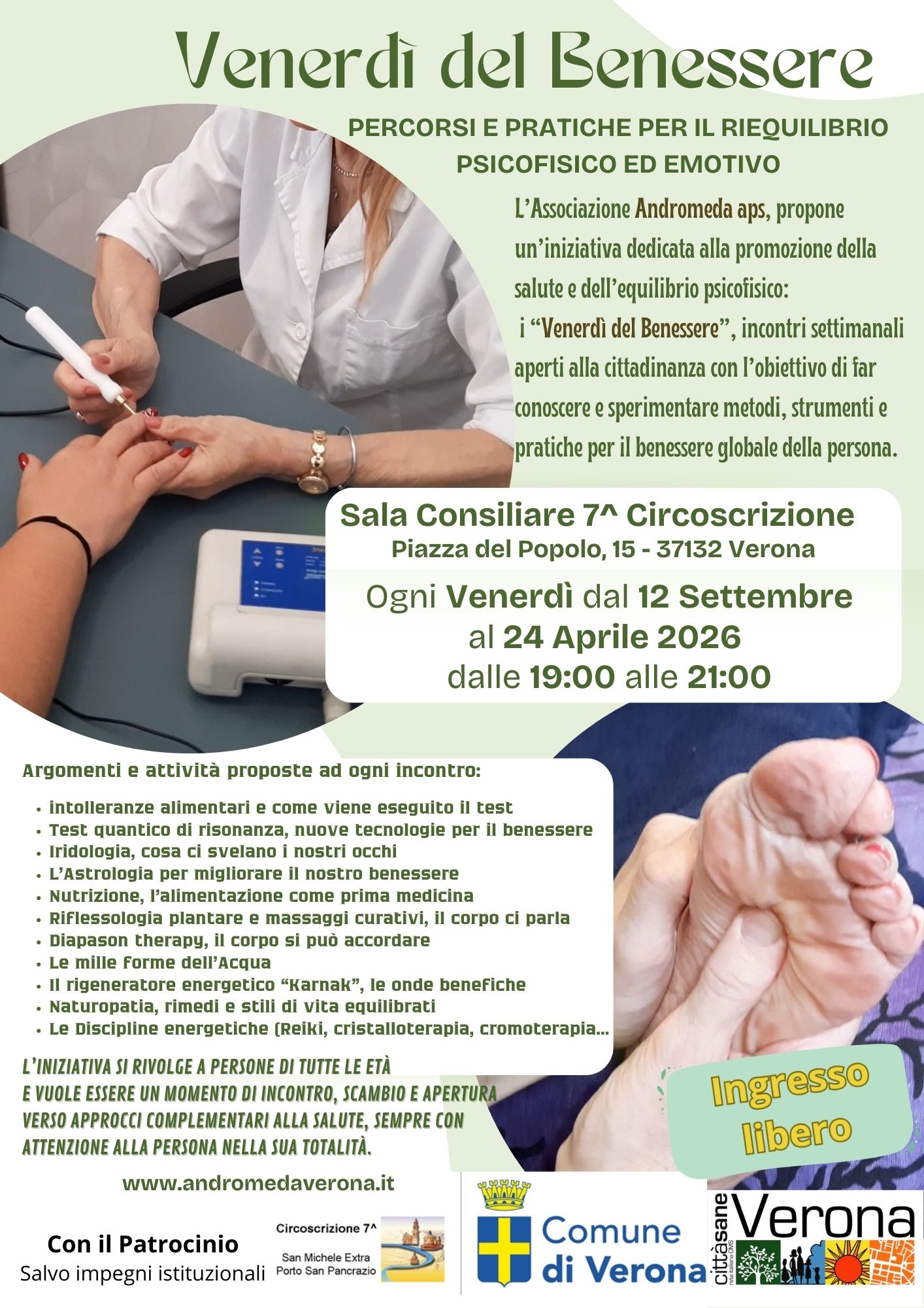 I Venerdì del Benessere è un'iniziativa organizzata dall'Associazione Andromeda con il patrocinio della Circoscrizione 7^ in Sala Consiliare, tutti i venerdì, dalle ore 19.00 alle ore 21.00, dal 12 settembre 2025 al 24 aprile 2026.
